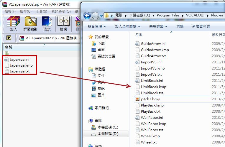 把Plug-in資料夾和IPHLPAPI.dll檔案移到安裝VOCALOID的資料夾即可(如下圖點擊放大)